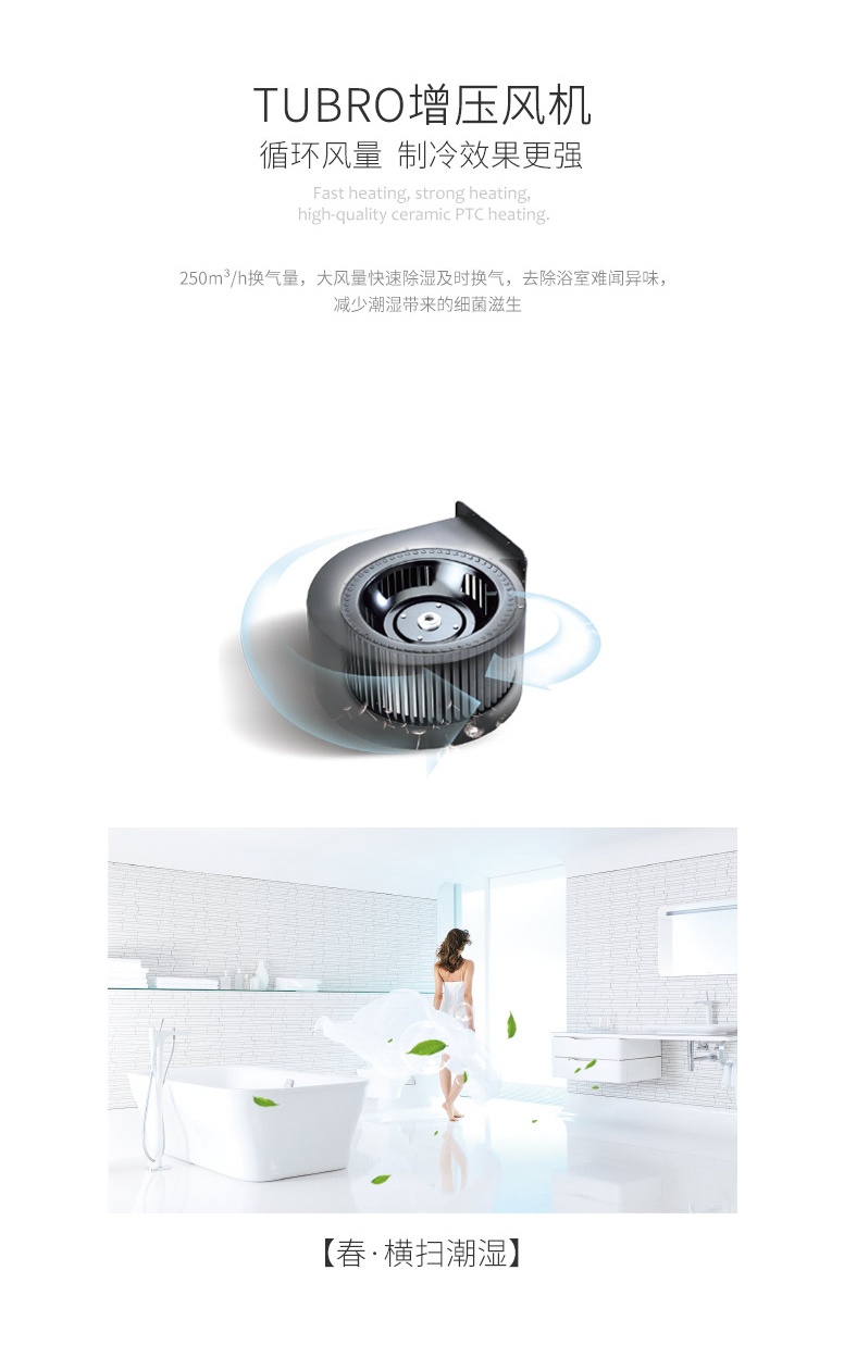 冬·無懼嚴寒:2600W制熱量,風輪吸氣,PTC發熱片加熱空氣。循環復式加熱,熱風排出后再吸入再次加熱,使浴室充滿均勻暖氣。
