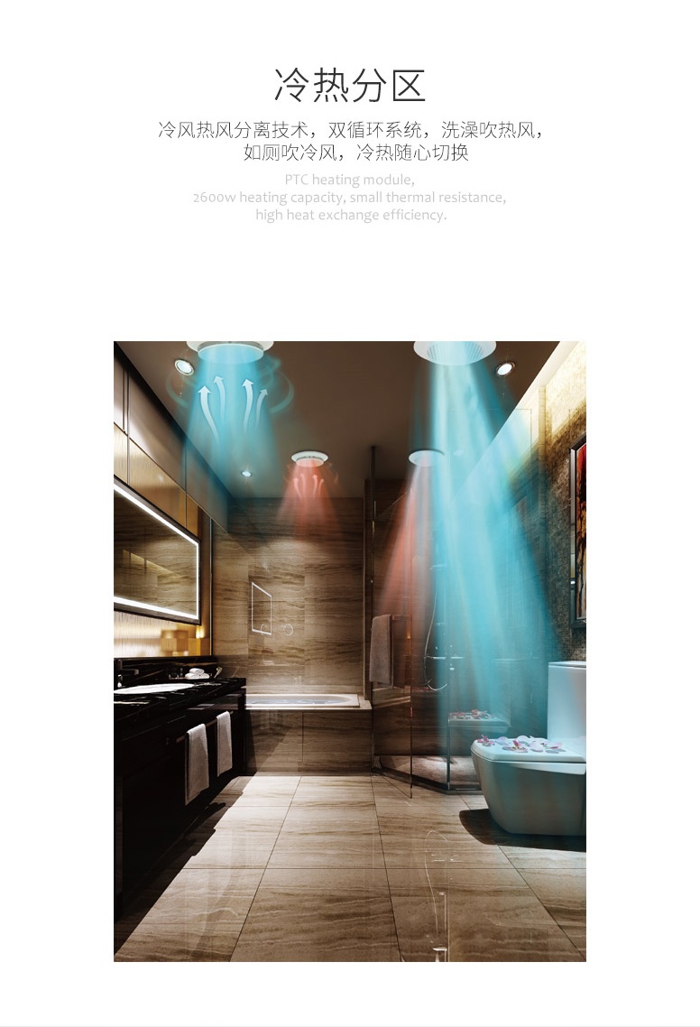 冷熱分區:冷風熱風分離技術,雙循環系統,洗澡吹冷風,如廁吹冷風,冷熱隨心切換。