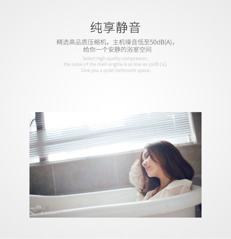 純享靜音:精選高品質壓縮機,主機噪音低至50dB(A),給你一個安靜的浴室空間。